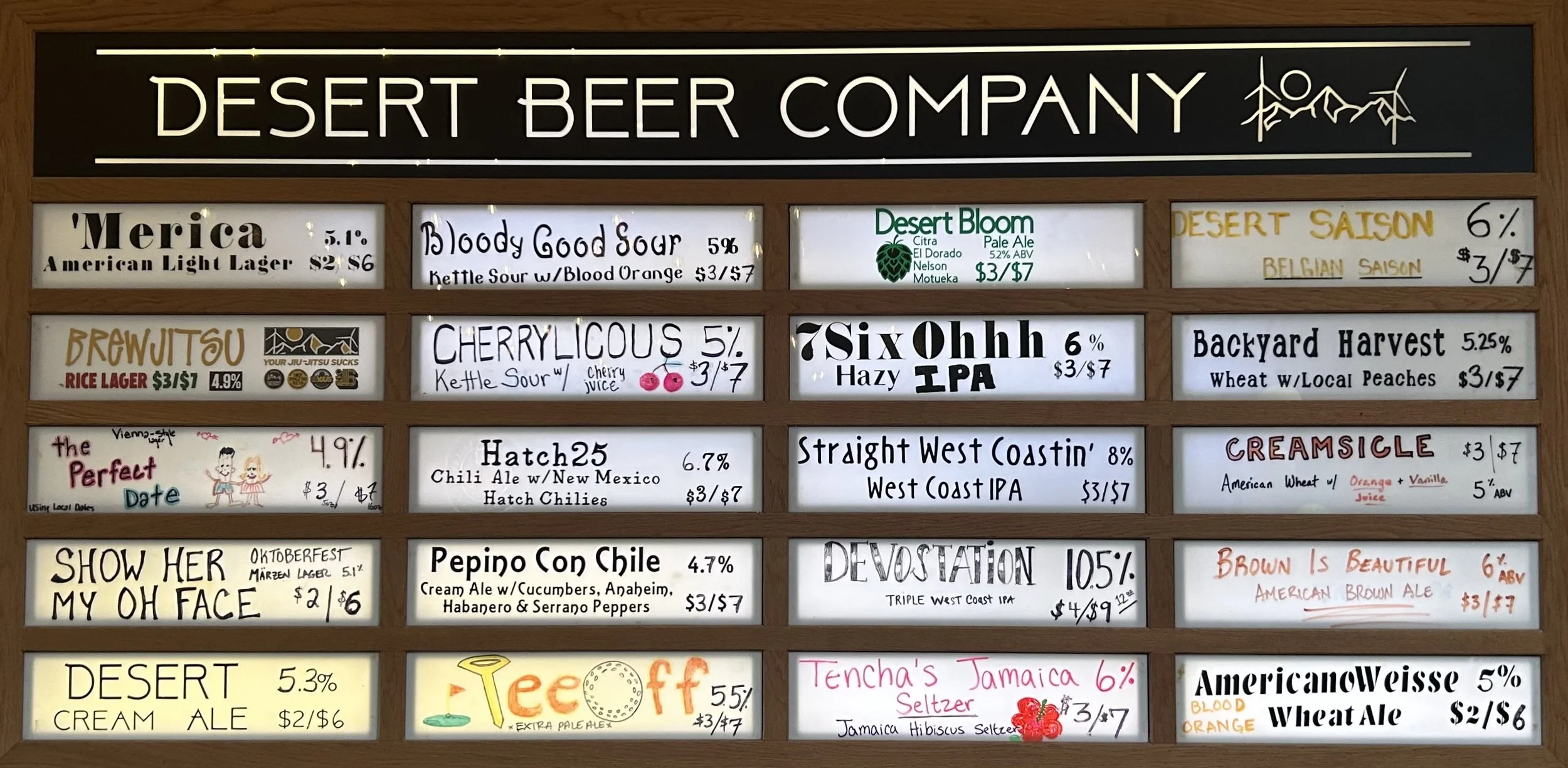 Desert Beer Company is the concept of Devon Sanchez, owner and brewer. The brewery is open as of July 2019. It is conveniently located off the 10 and Country Club.