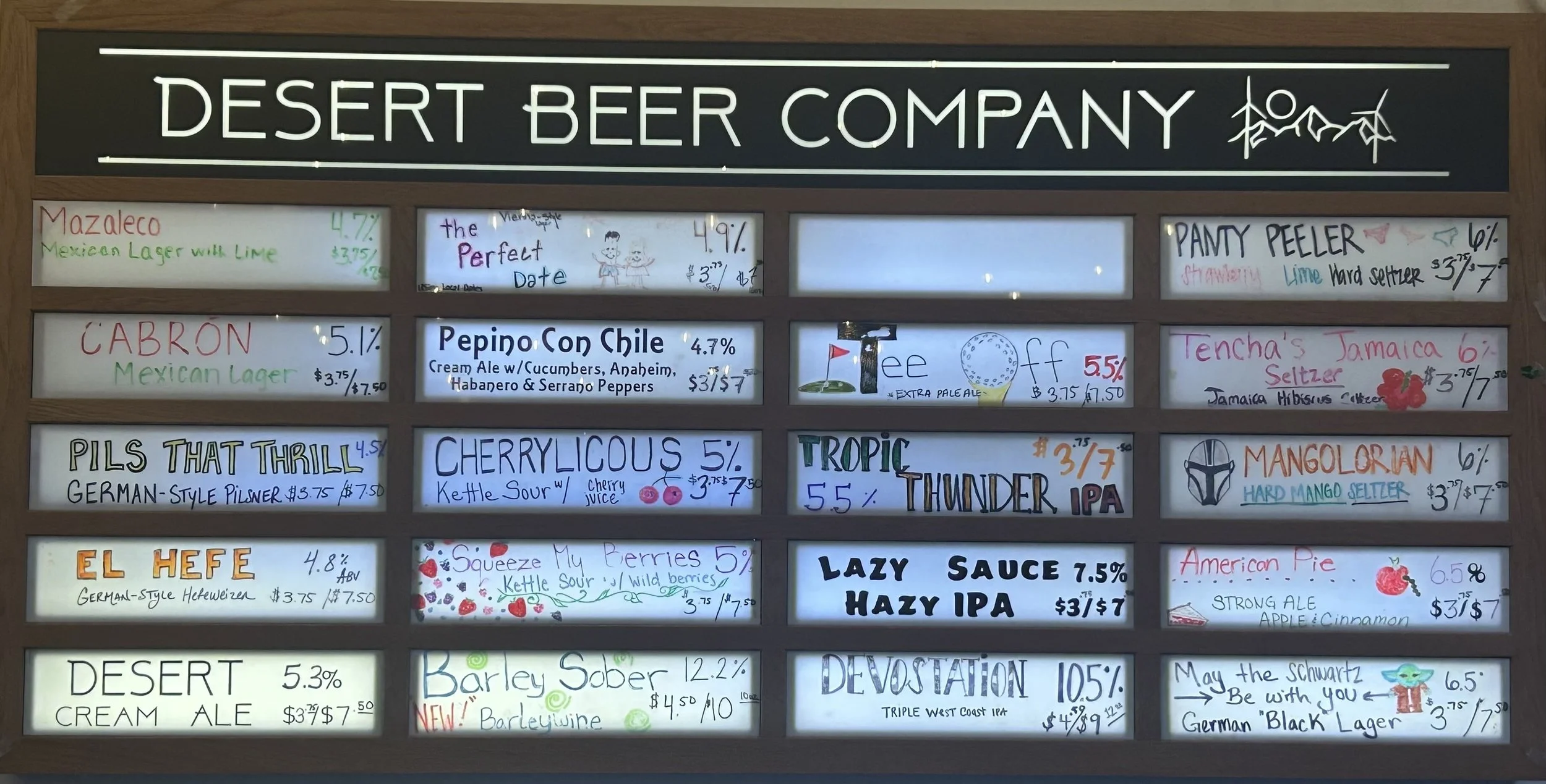 Desert Beer Company is the concept of Devon Sanchez, owner and brewer. The brewery is open as of July 2019. It is conveniently located off the 10 and Country Club.